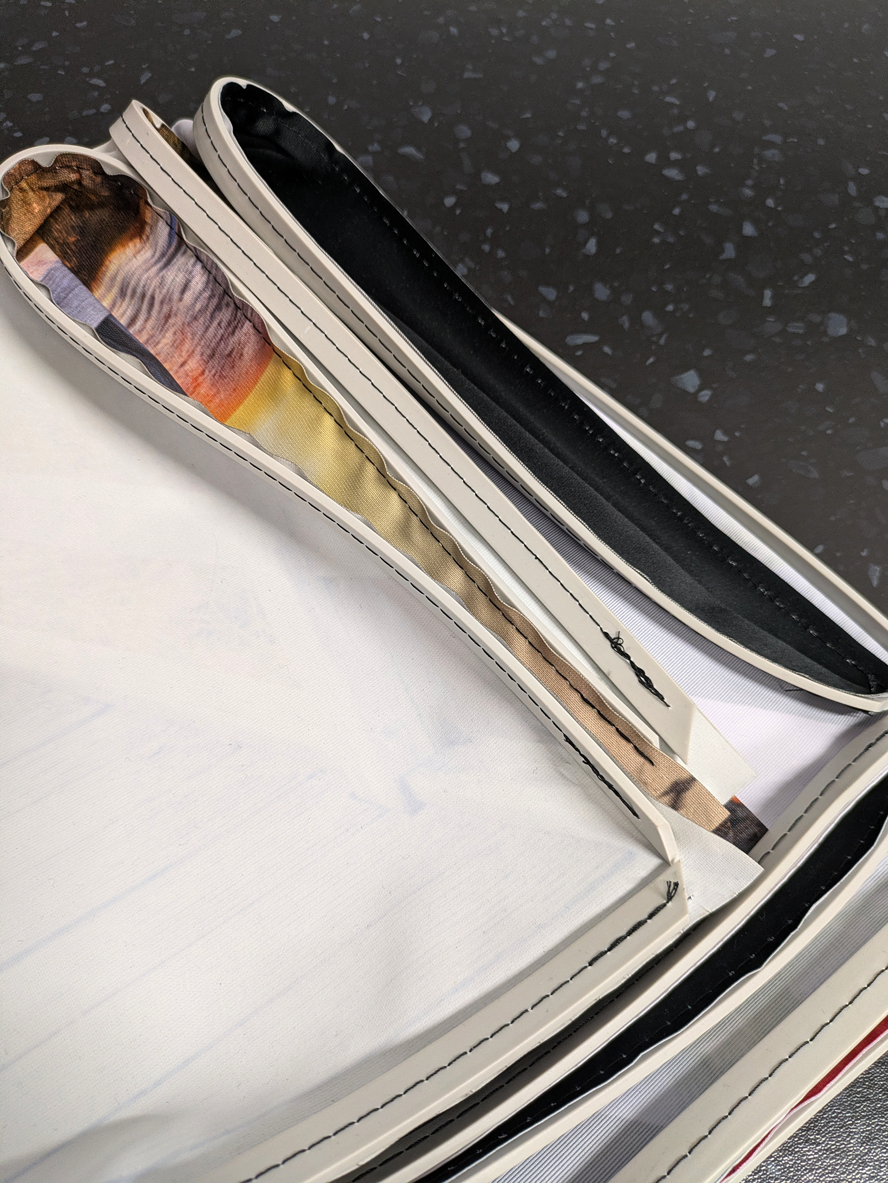 Traditional SEG systems rely on silicone beading—a material that complicates recycling. Our EcoBead alternative eliminates silicone entirely, making end-of-life processing cleaner and more efficient without sacrificing tension or durability. Recycled plastic beading is sewn to the MDK Grey-Back material allowing it to fit in aluminum framing systems such as BeMatrix™ or Aluvision™. The beading is 100% recyclable after use.